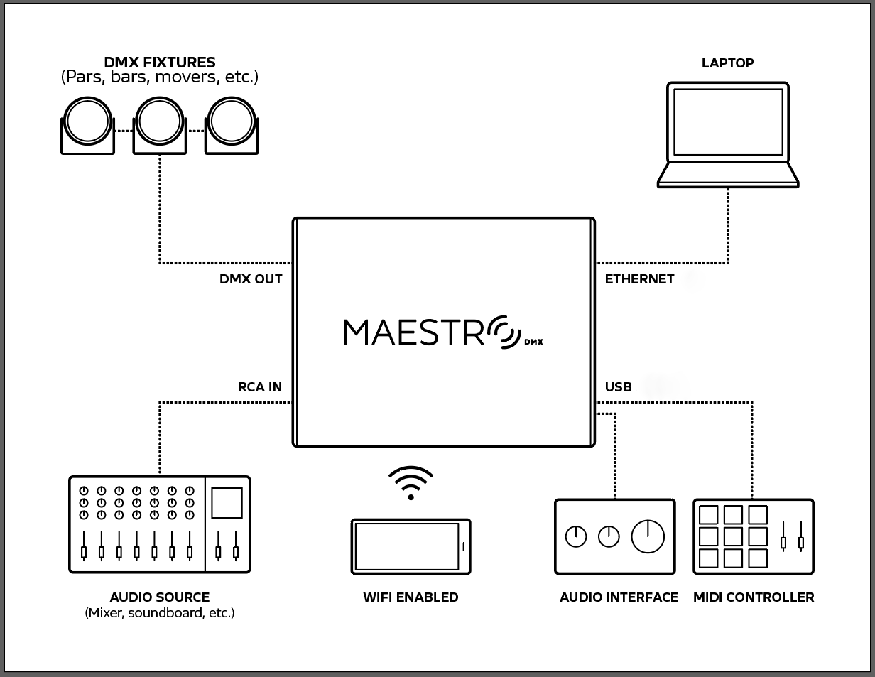 MaestroDMX offers seamless lighting control, providing flexibility in its placement as long as it remains connected to a power source, audio input, and your DMX fixtures.