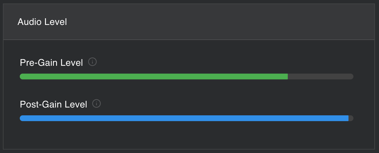 The Pre-Gain level displays the original audio input level. The display meter has three color states: