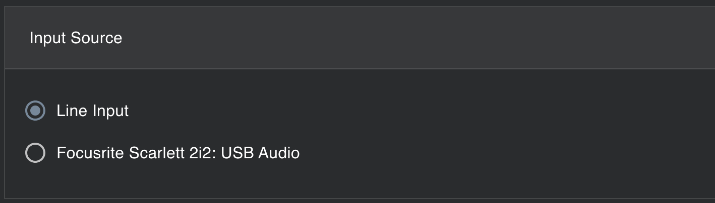 Select the audio input source. By default, MaestroDMX only has a single line-level input source that comes in via the RCA connector on the front panel.