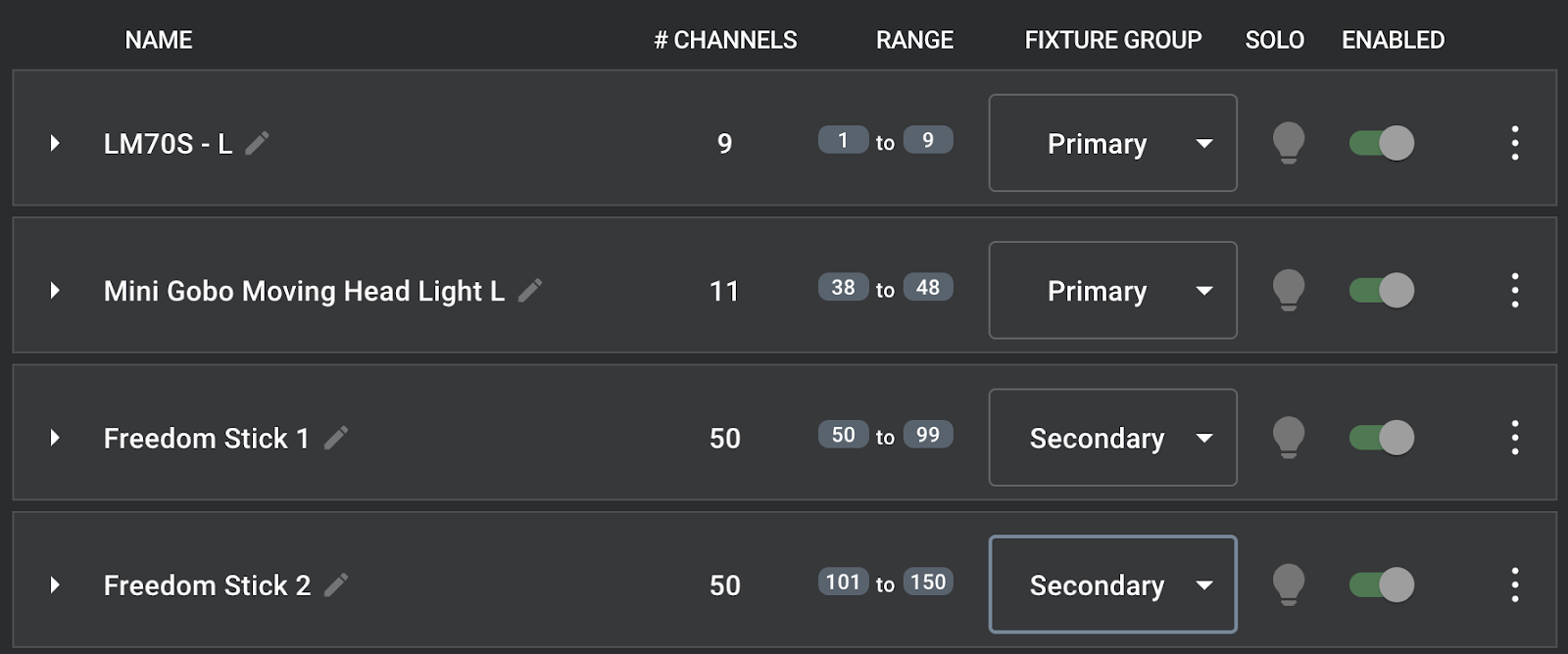 Enable/disable and solo any fixture(s)