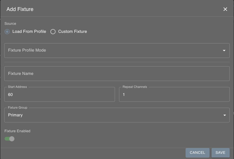 Choose “Load from Profile” (a fixture from the profile library) or “Custom Stage Fixture” (on-the-spot creation of a fixture)