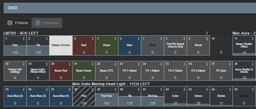 Each box will show the address it relates to at the top left. The name of the channel in the middle and the numerical value between 0-255 being output at the bottom. The 3-dot menu will give you fixture-related options for the overall fixture that the channel belongs to.