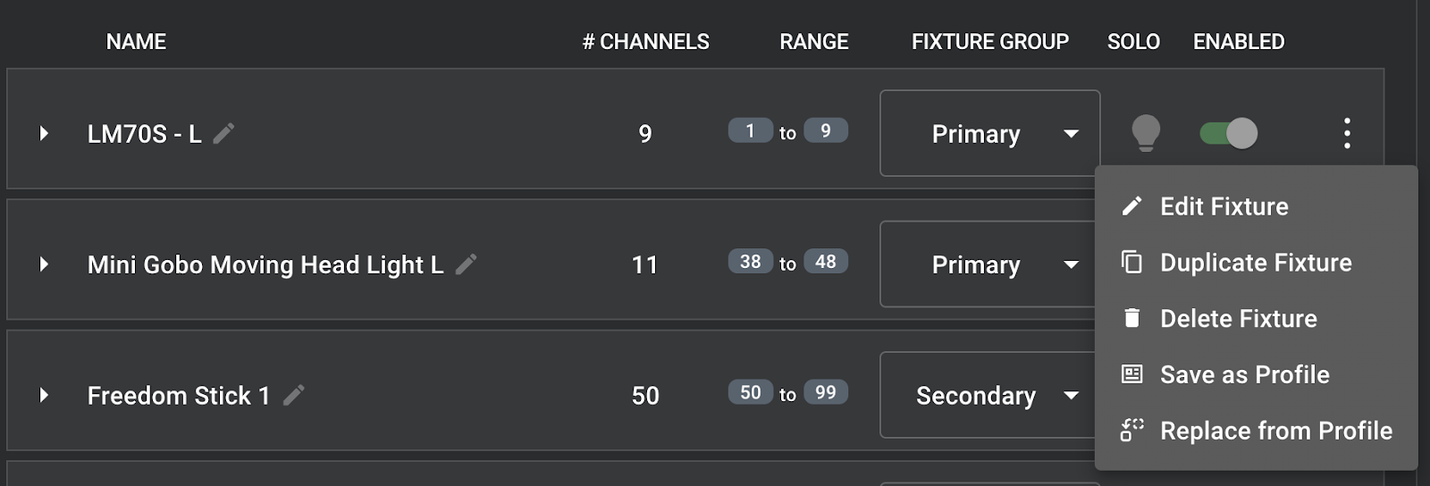 Each fixture is labeled at the beginning of the channel group with a 3-dot menu above the last channel of the fixture that will offer fixture-related menu options. If the fixture name is clicked, it will navigate to the control page with that fixture loaded.