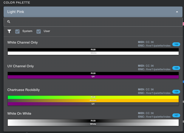 MaestroDMX comes pre-loaded with a variety of color palette options that support RGBWAUV. There are two types of palettes: Grouped Palettes and Individual/Extended Palettes (single color and gradients). Users can also create and use both custom Grouped Palettes and custom Individual/Extended Palettes.
