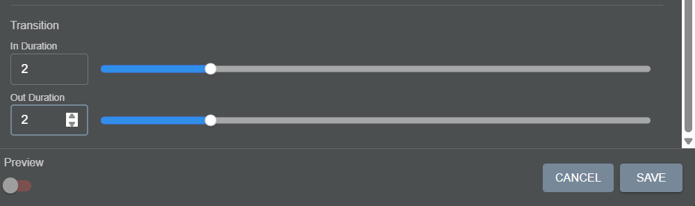 There are 2 sliders, and In Duration and Out Duration. In time will be how long each cue takes to go from black to full brightness. Out times will be how long the same cue takes to go to black.