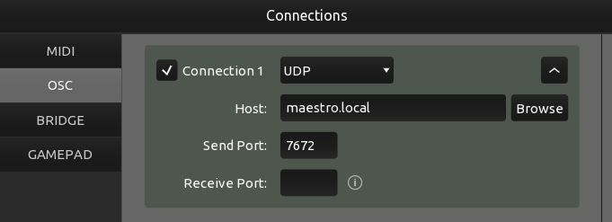 OSC stands for Open Sound Control. It's a protocol used for networking sound synthesisers, computers, and other multimedia devices. OSC is designed to be more flexible and expressive than MIDI (Musical Instrument Digital Interface), allowing for high-precision control over networks like Ethernet or Wi-Fi. Similar to MIDI, OSC can be used to control MaestroDMX in real-time. Industry-standard controllers, such as lighting desks and architectural lighting control systems, can output OSC to control MaestroDMX over a network.