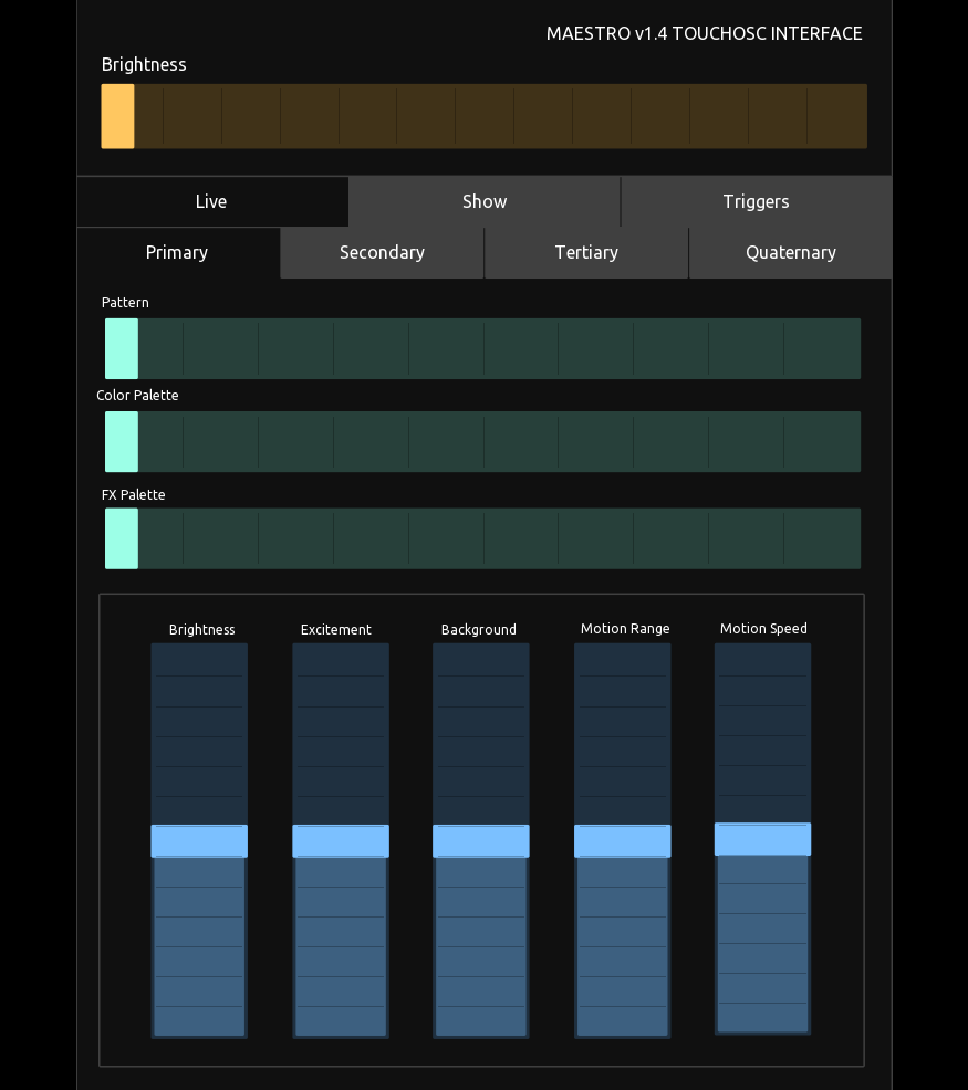 TouchOSC is a great 3rd-party app that allows user created custom OSC-based interfaces to control MaestroDMX. TouchOSC runs on PCs, tablets, and phones. For example, a restaurant or bar could have a tablet touch screen mounted to the wall with single buttons to switch between colours, or ambient to party looks. You can easily create a TouchOSC interface that has one slider for stage brightness, and 3 buttons to trigger different cues in MaestroDMX representing different vibes for the evening that could be ‘Static’, ‘Chill, or ‘Party’. TouchOSC allows you to do this with ease.