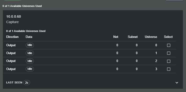 The IP Address and Name of the discovered nodes will be shown. Users have the option to select which universe of DMX data is sent.